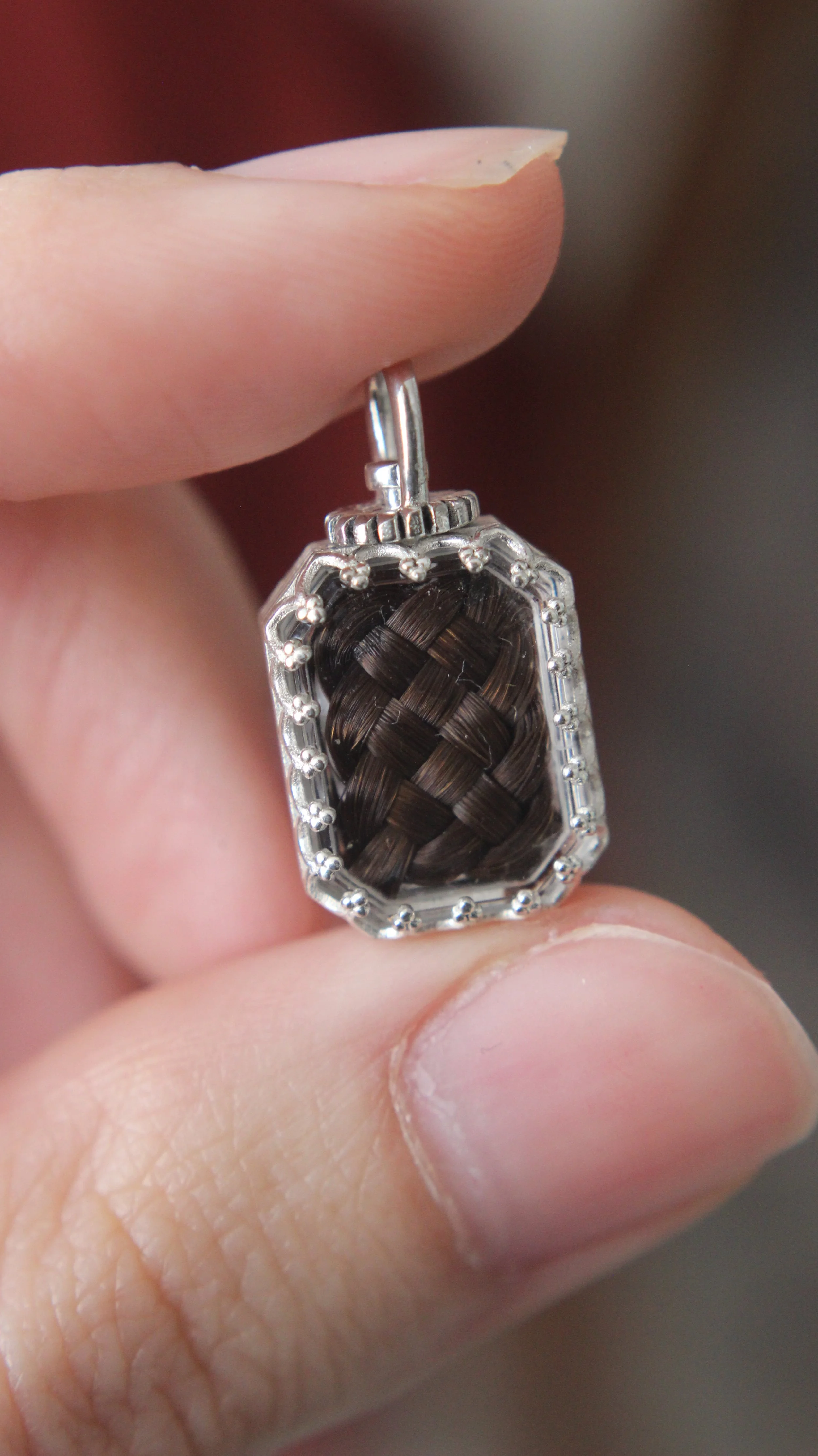 Hair measuring under 6" will be trimmed to fit, or wrapped in a circle depending on its texture. Hair over 6" long presents some more ornate options like a woven basket knot or a Victorian-inspired braid. Weavings of human hair are best suited for a rectangular locket. Horse hair is best suited for a round locket. Whiskers will need to be cut to fit in a locket of any shape; an alternative option that keeps whiskers intact is available here.