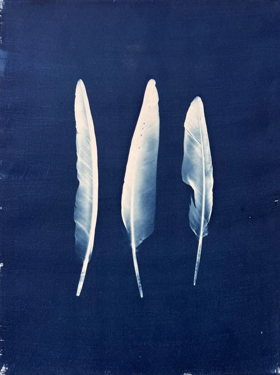 Still, I hated having to say no thank you, and wanted to find a way to pay tribute to all of the small birds who had given their lives to nurture the incredible predators who have taken up residence on the fire escape. While these bird parts themselves didn’t fit a specific vision for any artwork of mine at the time, I dug into my past life as a printmaking and traditional photography student and decided that the cyanotype process could be the perfect homage.